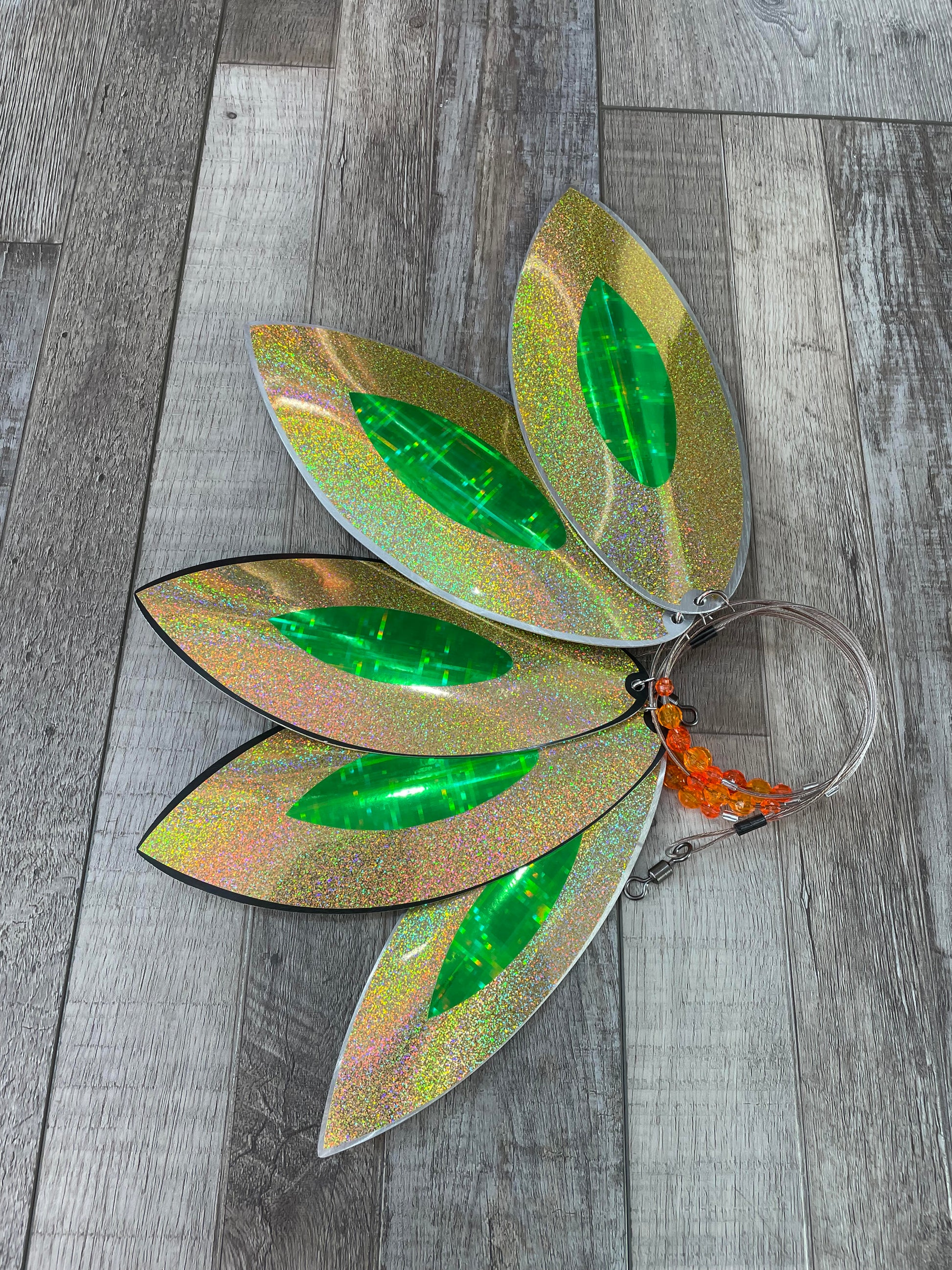 These blades are somewhat skinnier and a bit longer than the football blades. They look very fish as they spin through the water.